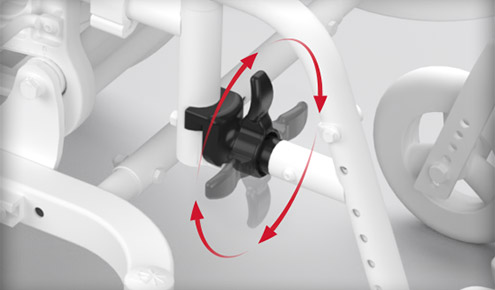 Kompaktowa konstrukcja uchwytów umożliwia ich obrót w zakresie od 30° do 270°, co pozwala opiekunowi zawsze ułożyć dłonie w komfortowej pozycji – niezależnie od kąta odchylenia wózka. Uchwyty można również złożyć całkowicie wzdłuż rur oparcia, co znacznie ułatwia transport wózka w ciasnych przestrzeniach.