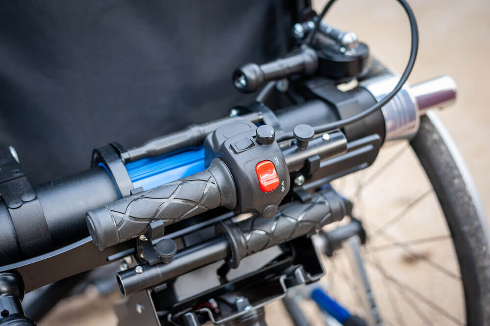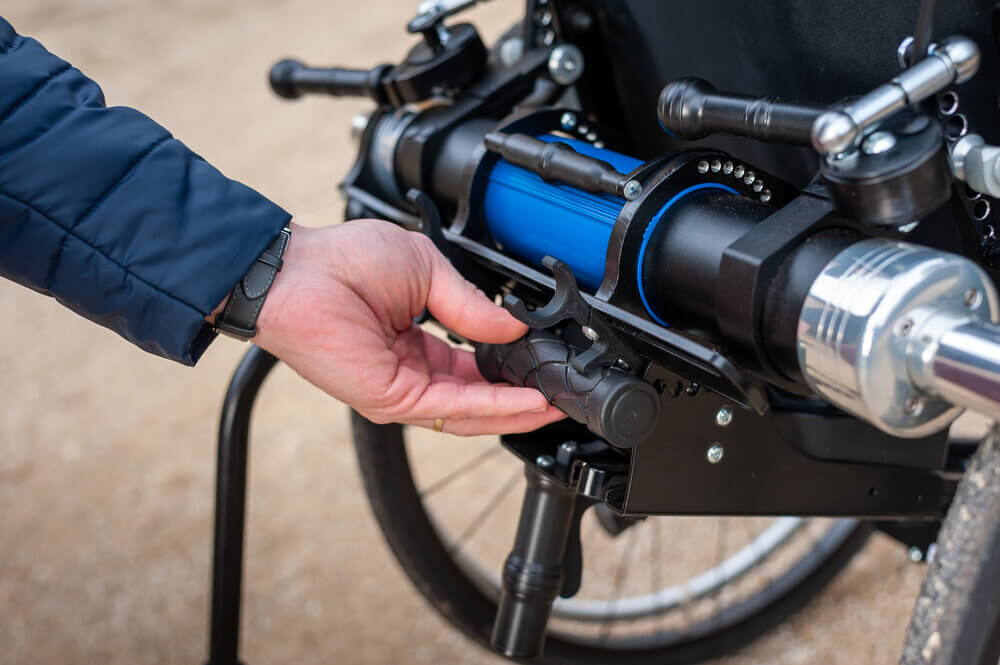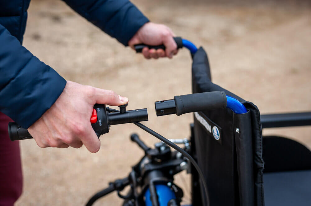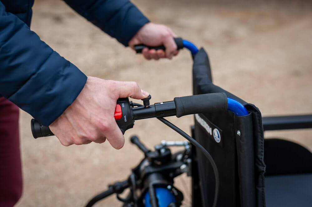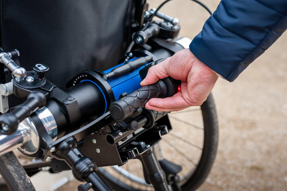 Montaż Light Assist 2.1 na wózku zajmuje mniej niż 15 sekund. Prędkością sterujesz, obracając manetkę zamontowaną na jednej z tylnych rączek. Urządzenie działa również jak hamulec silnikowy podczas zjazdów, zwiększając Twoje bezpieczeństwo.